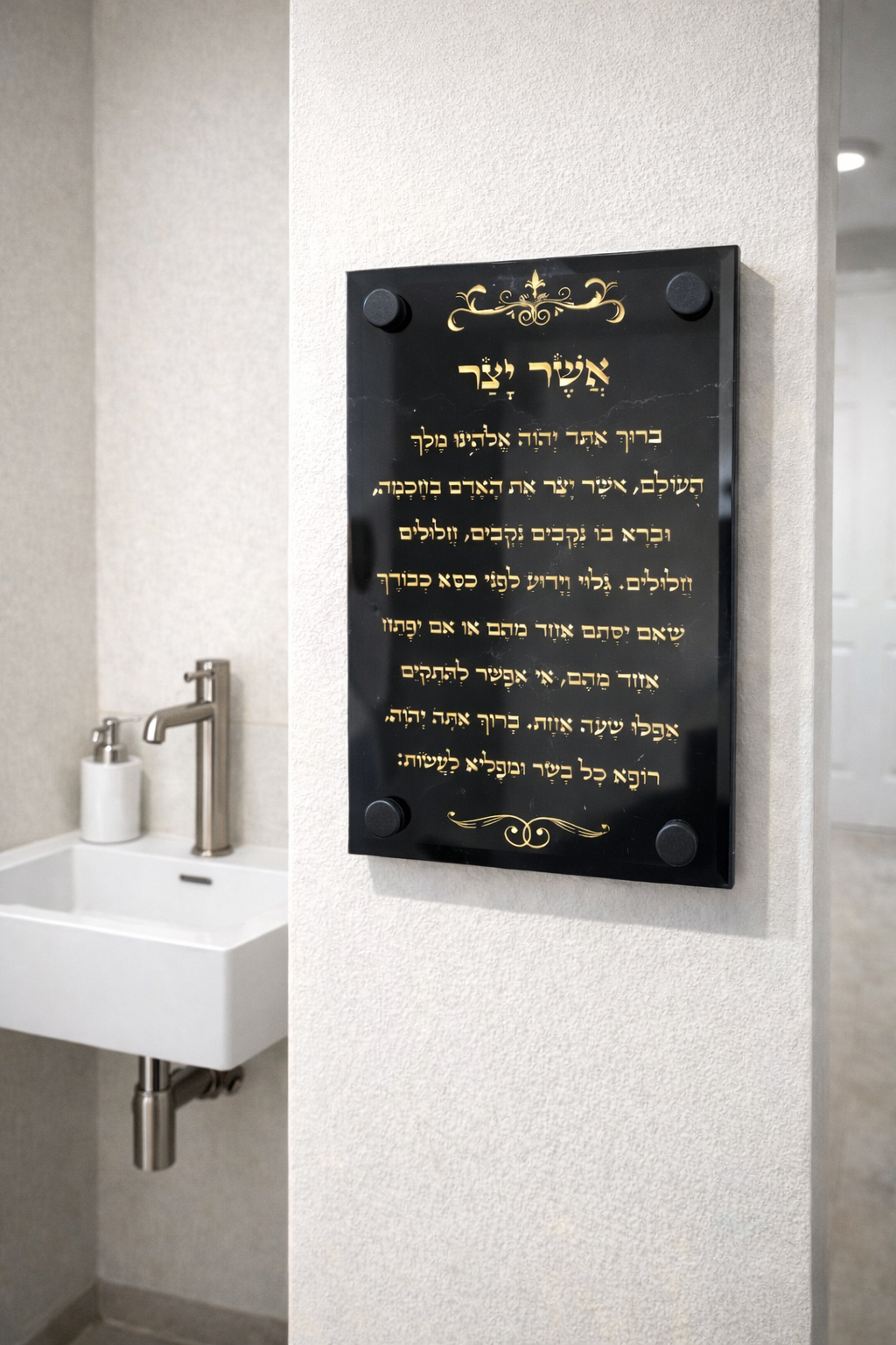 ברכת אשר יצר – רקע שיש שחור טקסט זהב עם עיטורים